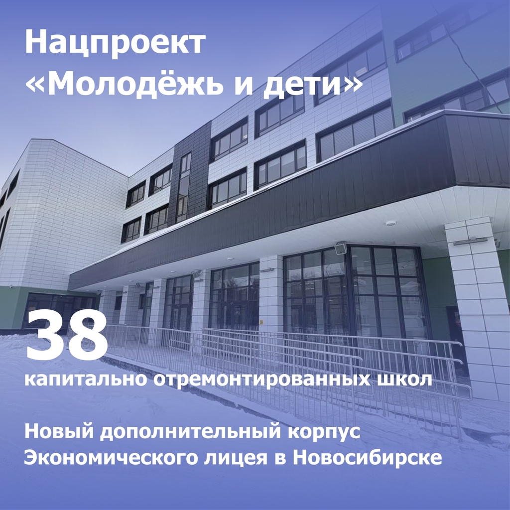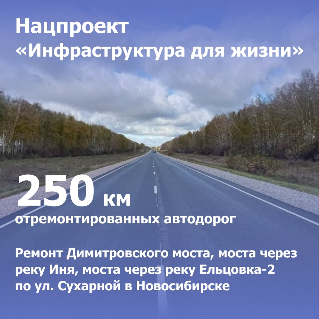 Более половины этих средств направлено на реализацию нацпроекта «Инфраструктура для жизни», благодаря которому, в том числе, отремонтированы Димитровский мост, мосты через Иню и Ельцовку-2, реконструировано 250 км автодорог, благоустроено 134 территории. Ещё около 40% выделенных средств реализованы в рамках нацпроектов «Молодёжь и дети», «Продолжительная и активная жизнь» и «Семья». В числе обновлённых объектов – 38 школ, 15 учреждений культуры, два учреждения здравоохранения и детский сад. Кроме того, построен новый дополнительный корпус Экономического лицея в Новосибирске.