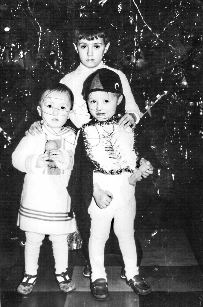 Сверху Денис , внизу справа Юлия в образе Снегурочки, слева Сергей – в костюме Вороны (1975 г.).