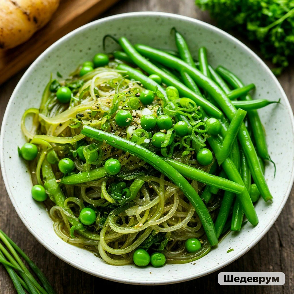 — по 100 г зелёных замороженных фасоли и горошка;