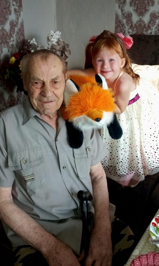 А это пятилетняя Екатерина Шалабанова из райцентра вместе со своим прадедушкой Николаем Сергеевичем Веселовым.