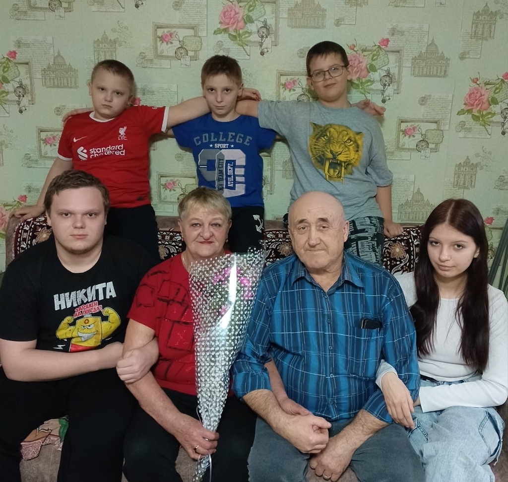 В окружении внуков: Никиты, Светы, Степана, Захара и Егора — Светлана и Евгений Михайловы из Довольного.