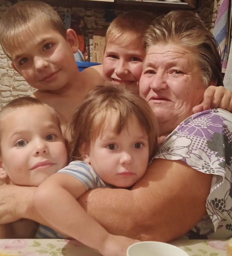 На фотографии Иван, Глеб, Егор, Есения Орловы из Волчанки со своей бабушкой Клавой, которая живёт в Алтайском крае. Фото сделано в 2021 году.