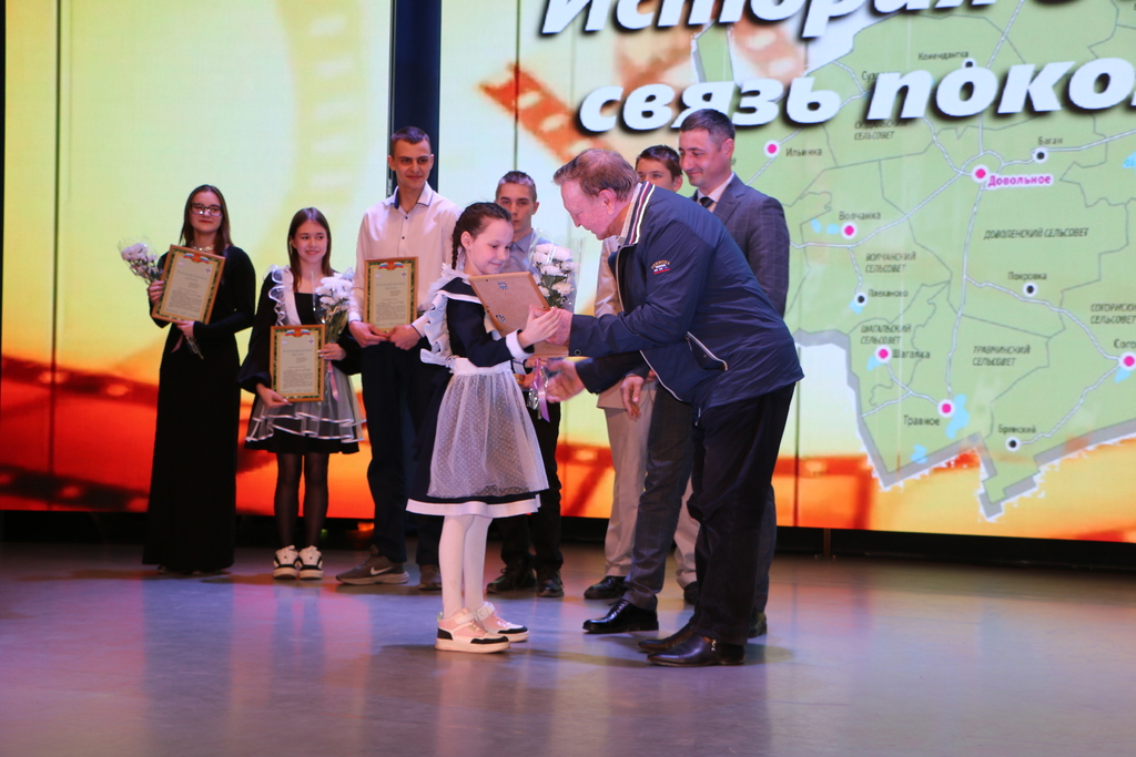 В тот же день на сцене были подведены итоги конкурса «Моя трудовая семья», организованного на территории Доволенского округа в рамках проекта «История в лицах: связь поколений». Победители – школьники округа – выходили на сцену с героями видеороликов и публикаций – своими родителями.