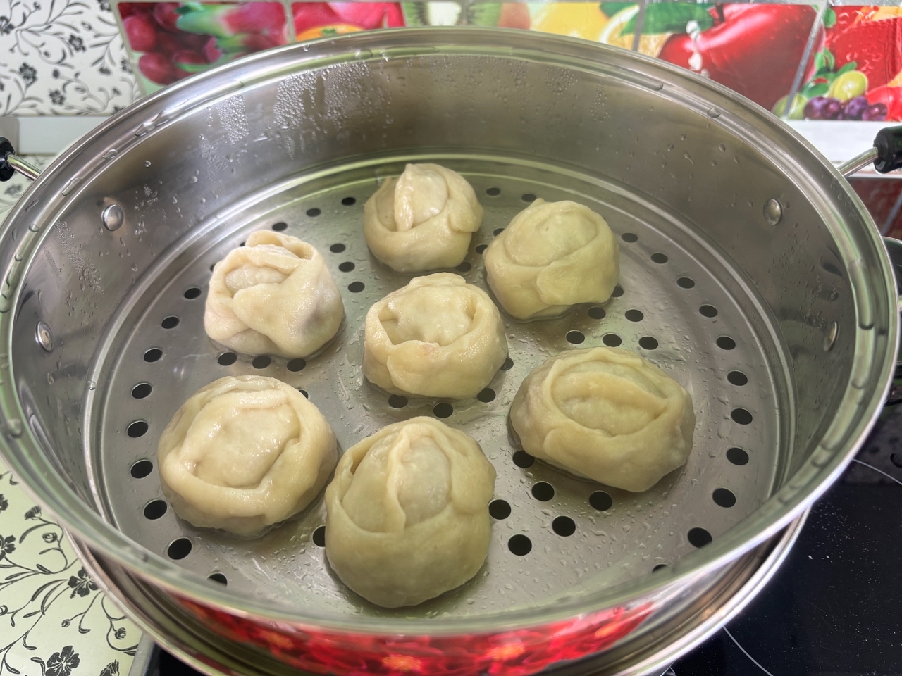Манты с тыквой варим, как обычно, в мантоварке, предварительно смазав дно сливочным маслом.