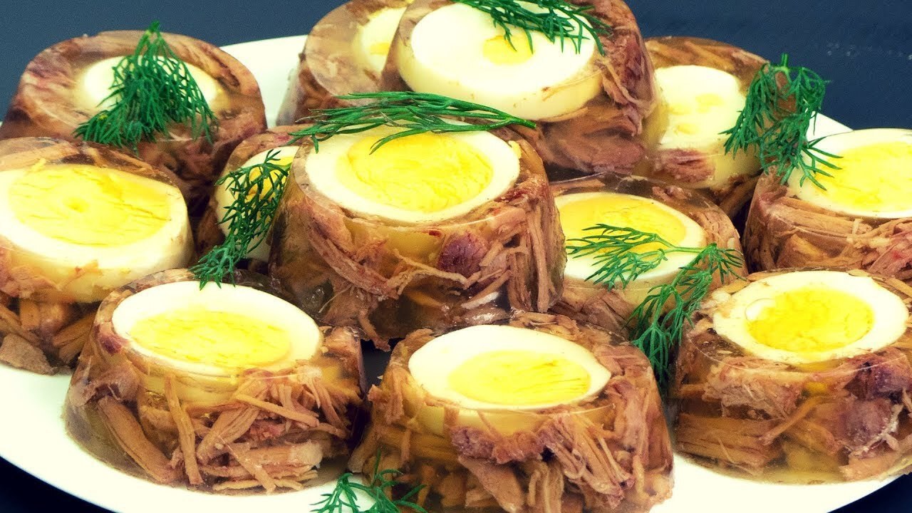 Ставим варить мясо. Можно использовать свинину. Спустя 60 минут добавляем лавровый лист, соль и перец. Варим ещё пару часов и сцеживаем бульон через сито. В 100 мл бульона добавляем желатин и всё перемешиваем. Оставляем бульон на 15 минут и разделяем мясо на волокна. Затем растапливаем набухший желатин в микроволновке (буквально несколько секунд, чтобы он стал жидким) и смешиваем с оставшимся бульоном. Варим яйца и разрезаем на две части. В формочки для кексов наливаем немного бульона, выкладываем яйца и наверх – мясо. Заливаем формочки бульоном и отправляем в холодильник на несколько часов. В результате, вместо привычного холодца, мы получим изысканное и красивое угощение, которое украсит любой стол.