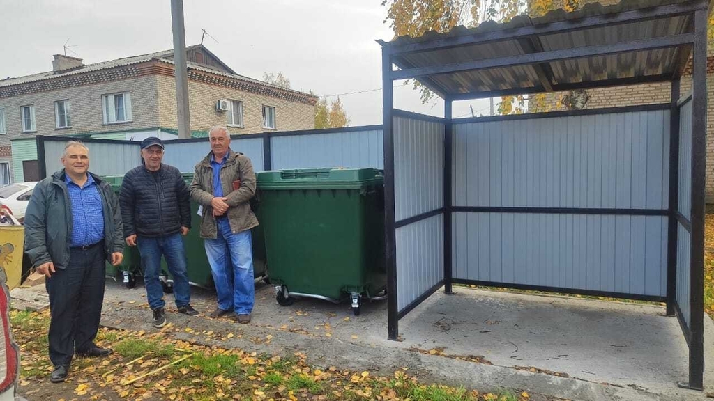 Каждая площадка имеет цементное основание площадью 7х2 метра и разделена на две части. Первая – крытая, предназначена для крупногабаритного мусора, на второй установлены три больших пластиковых контейнера для пакетированного мусора.