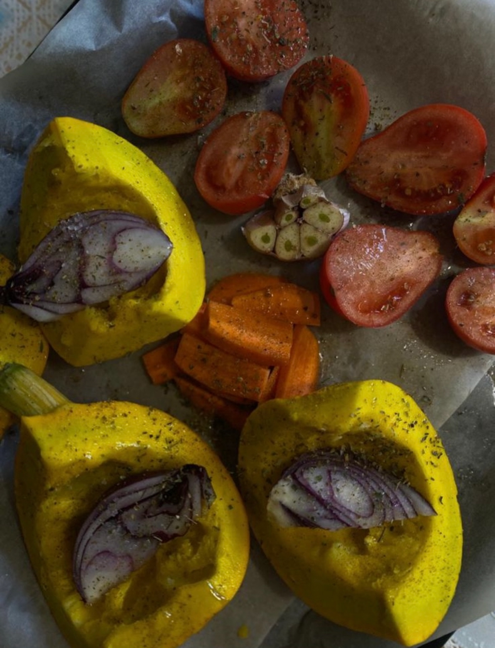 3. На застеленный пергаментом жарочный лист выложите равномерно все овощи. Сдобрите их заправкой из масла и специй. Запекайте в духовке при 180°C 30 минут (здесь ориентируемся на свою духовку).