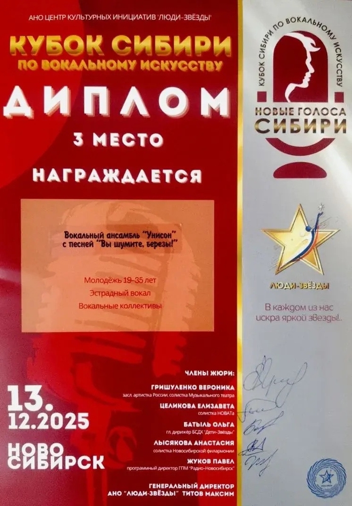 В декабре молодой доволенский вокальный ансамбль «Унисон» представил наш округ на престижном межрегиональном конкурсе «Кубок Сибири по вокальному искусству «Новые голоса Сибири», который прошёл в ДК им. Октябрьской революции (г. Новосибирск).