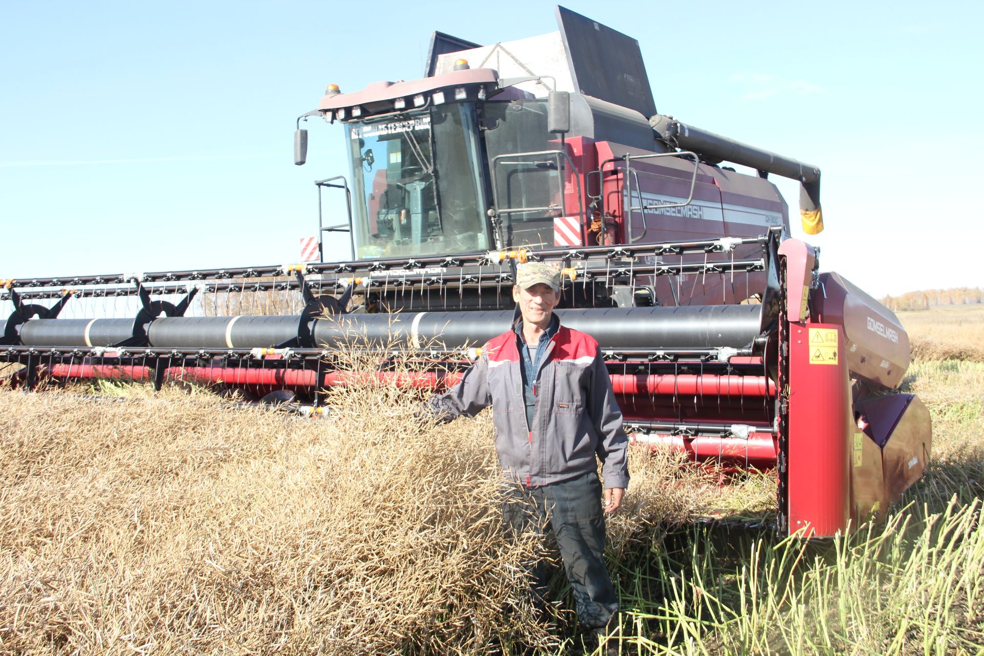Механизатор отмечает, что уже убирал пшеницу, ячмень, лён, рапс. Урожай везде хороший, тем более учитывая дождливое лето. Вот так, в спокойной беседе, мы заканчиваем очередную полосу. Механизатору нужно переезжать на новый участок. Пришла пора прощаться.