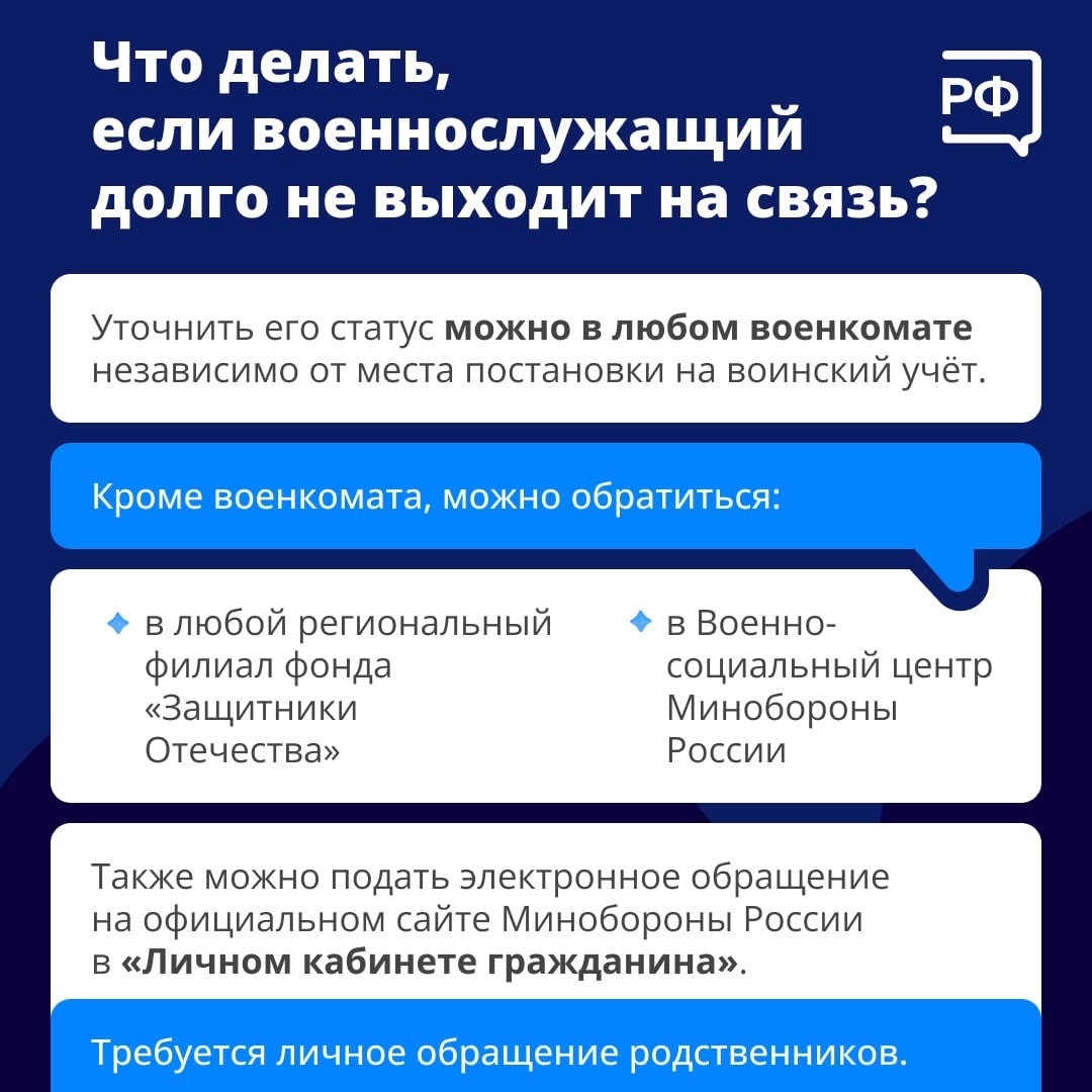 Родным военнослужащих, которые долго не выходят на связь, можно обратиться в любой военкомат независимо от места постановки на учёт. Кроме военкомата можно уточнить информацию в любом региональном филиале фонда «Защитники Отечества». Также можно подать электронное обращение на официальном сайте Минобороны России в «Личном кабинете гражданина».