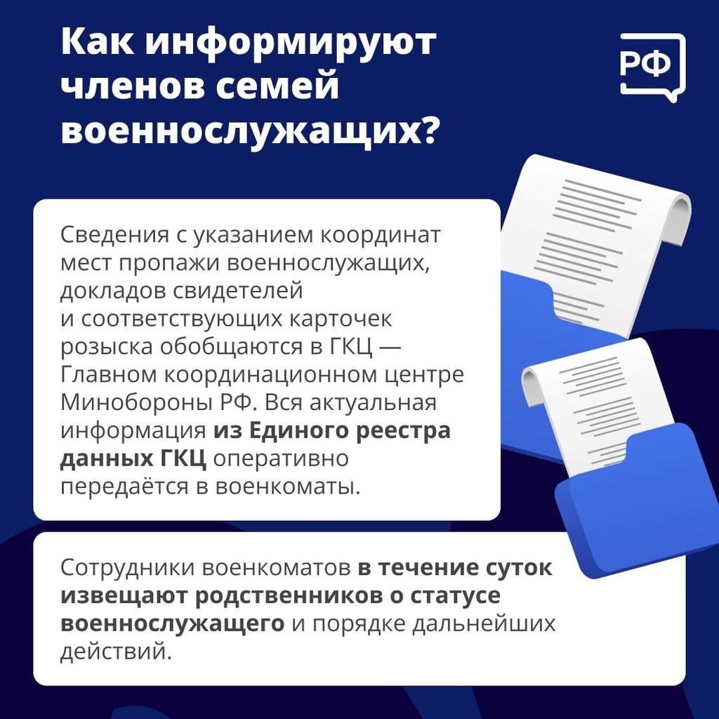 Сведения с указанием координат мест пропажи военнослужащих, докладов свидетелей и соответствующих карточек розыска обобщаются в ГКЦ – Главном координационном центре Минобороны РФ. Розыск пропавших без вести военнослужащих ведёт также ГКЦ. Вся актуальная информация из Единого реестра данных ГКЦ оперативно передаётся в военкоматы.
