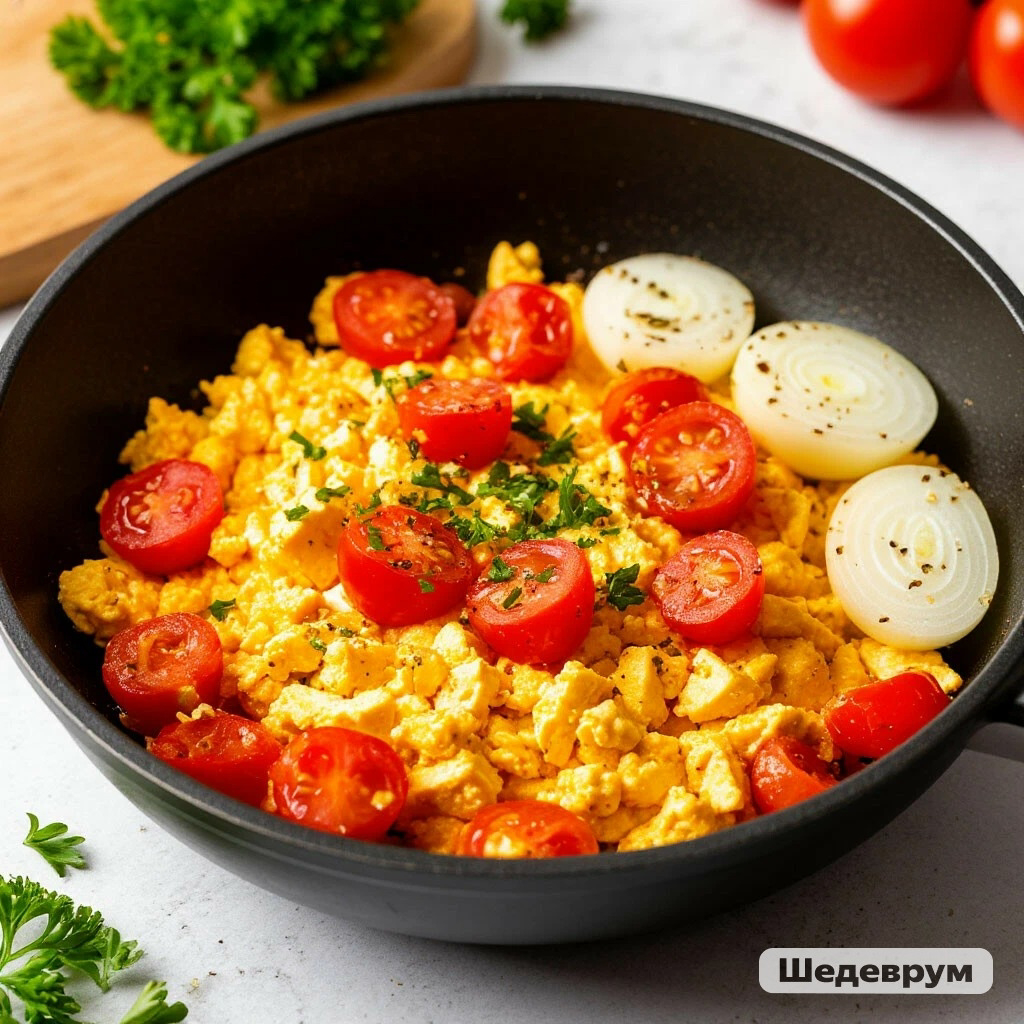 Если вы привыкли начинать свой день с жареных яиц или омлета, то этот рецепт точно для вас. «Яичница» из тофу по вкусу почти не отличима от настоящей, но при этом не содержит ни одного яйца. Подавайте её на стол прямо в сковороде, посыпав любой свежей зеленью и дополнив лепёшками или цельнозерновым хлебом.