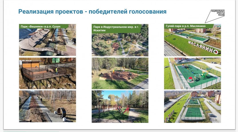 В качестве примера благоустроенных общественных пространств, победивших в голосовании в разные годы можно назвать парк «Вешняки» в р.п. Сузун, парк в Индустриальном микрорайоне города Искитима, Гуляй-парк в р.п. Маслянино.