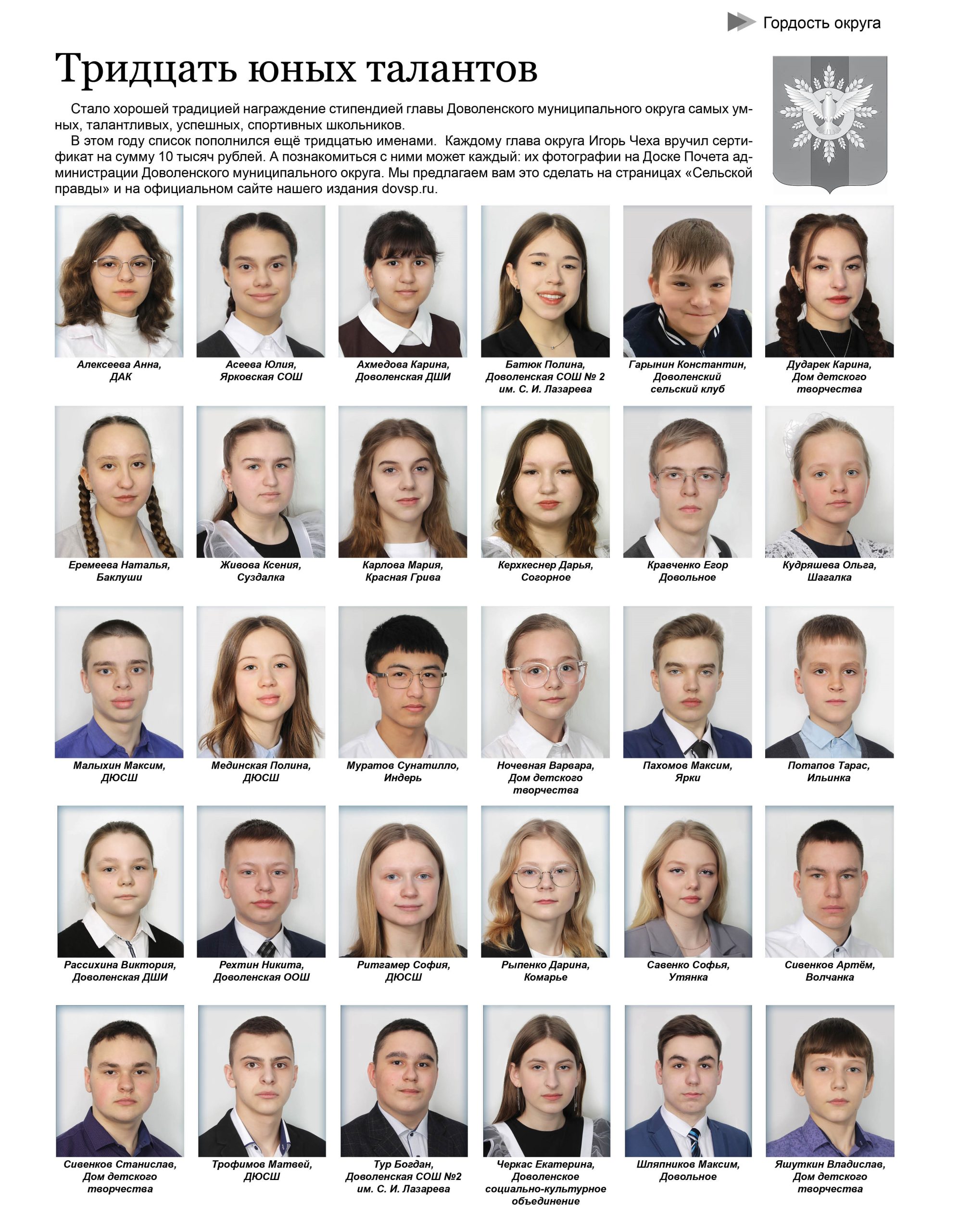 В этом году список пополнился ещё тридцатью именами. Каждому глава округа Игорь Чеха вручил сертификат на сумму 10 тысяч рублей. А познакомиться с ними может каждый: их фотографии на Доске Почета администрации Доволенского муниципального округа.
