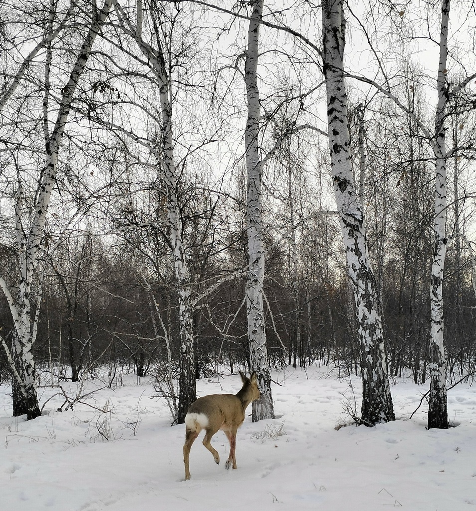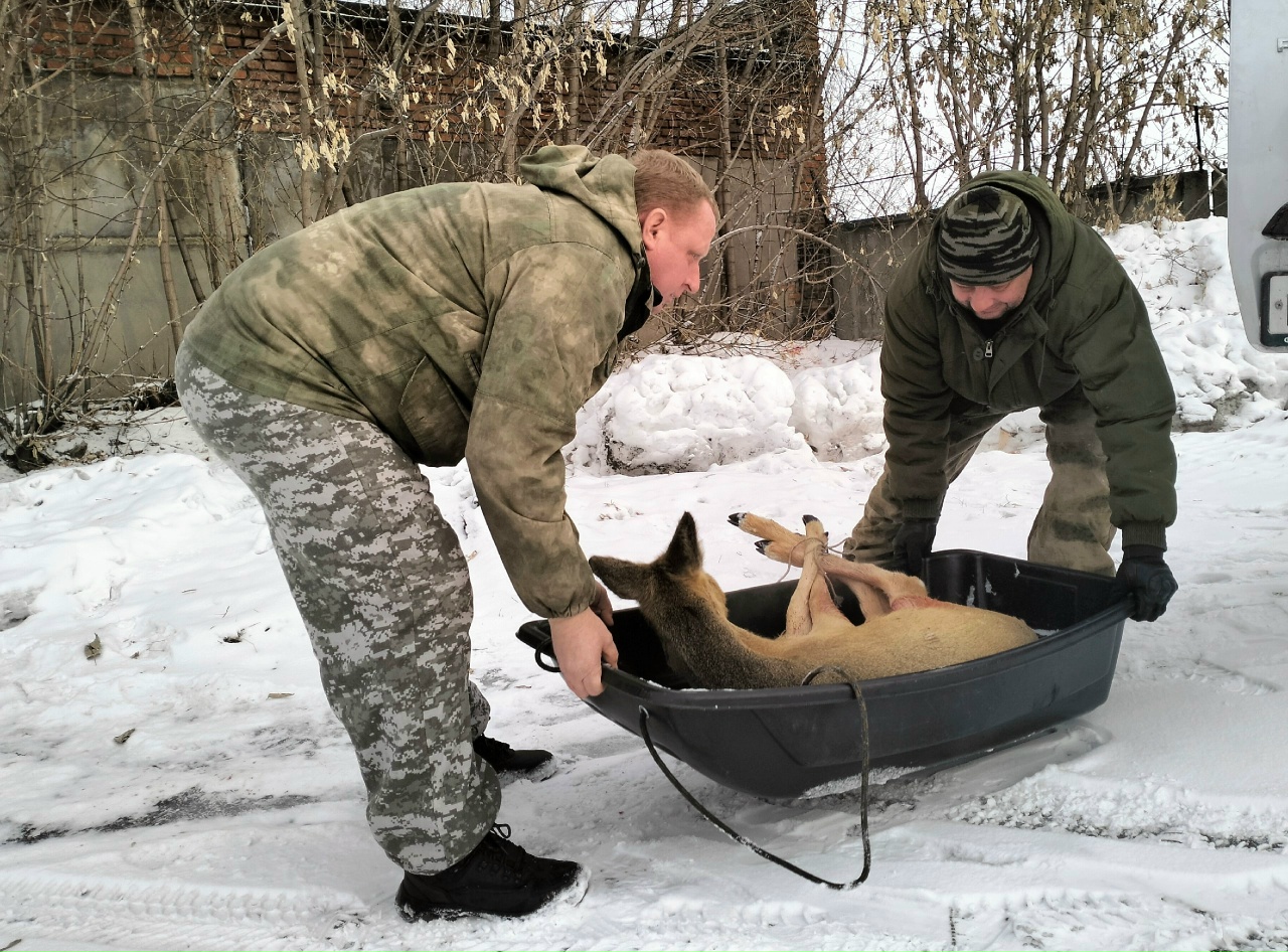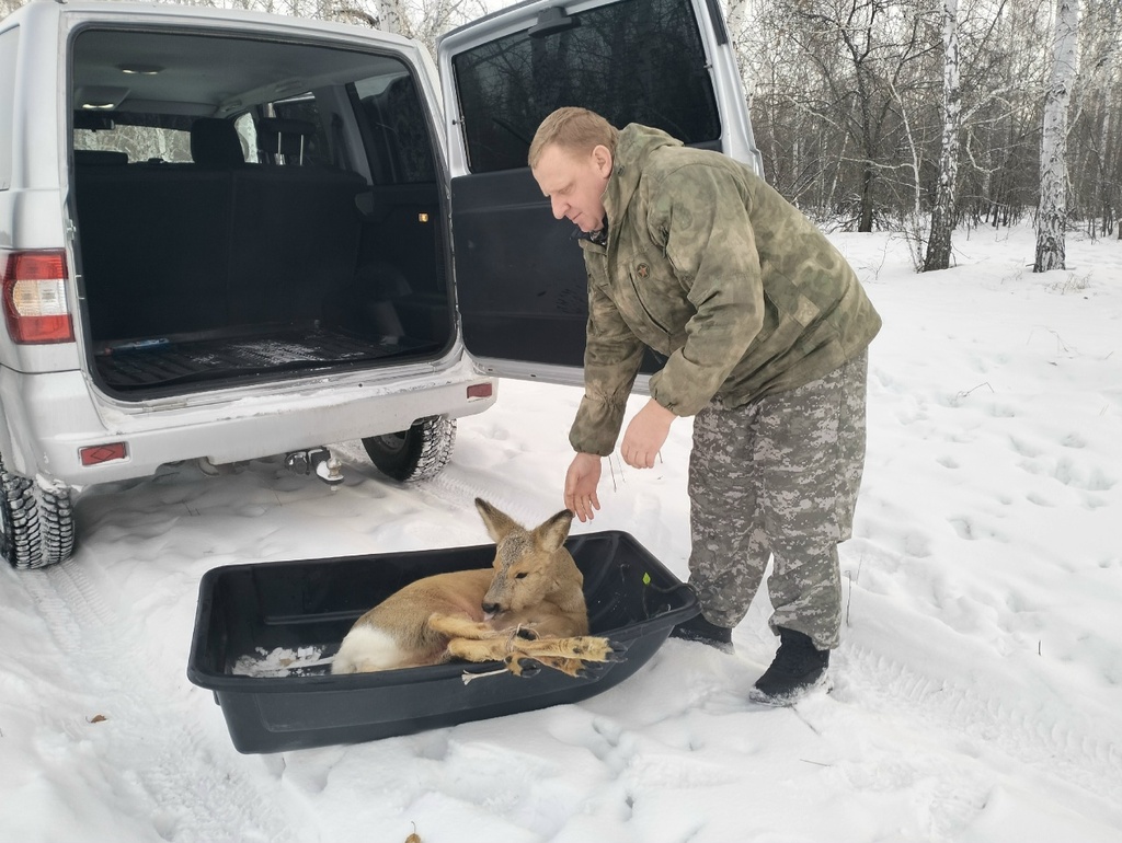 На место происшествия выехал госинспектор Краснозерского района по охране животного мира. Вместе с помощником они погрузили и вывезли косулю в лес подальше от поселка. Косуля убежала в привычную ей обстановку.