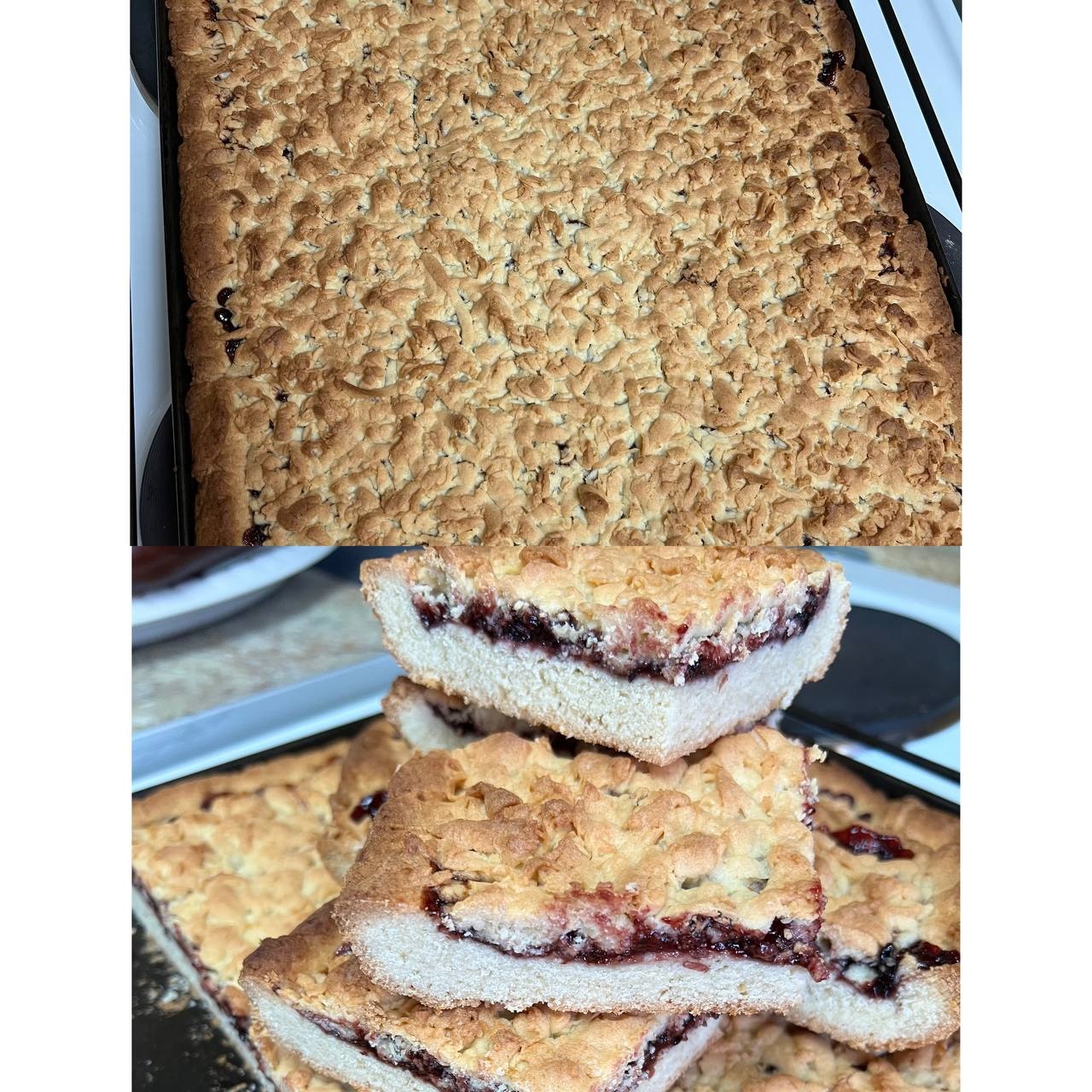 Приготовление: яйца смешиваем с сахаром, добавляем размягчённый маргарин комнатной температуры, соду (Виктория добавляет ещё немного разрыхлителя для пышности теста, тоже щепотку), перемешиваем и всыпаем постепенно муку. Тесто должно получиться не очень крутое, мягкое, не липнущее к рукам. Далее тесто делим на две части, одна – немного больше, она будет дном и бортиками пирога, вторую убрать в морозилку. Распределяем по форме первую часть теста, выкладываем варенье (можно брать любой джем, только не жидкий, но хозяюшке больше всего нравится смородиновый) и натираем на тёрке вторую часть теста, делая верхний слой. Отправляем в духовку минут на 30-40 при температуре 180 градусов.