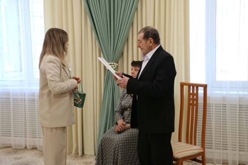 Ведущий специалист отдела ЗАГС Татьяна Крикуненко провела гостей по страницам жизни супругов.
