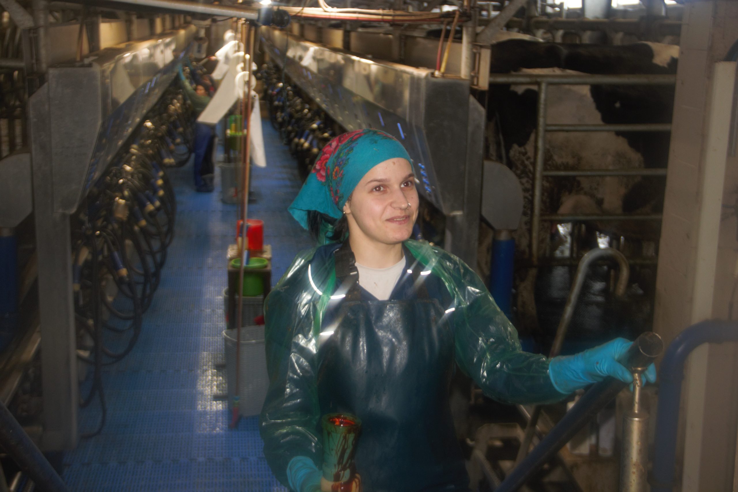 Первая дойка начинается в районе 8 часов утра и в среднем длится до 4 часов вечера. Через час начинается вторая, где доится лишь малая часть поголовья, в среднем 400-450 голов. Это коровы после растёла, пик их лактации приходится в среднем на 60 день после отёла, тогда они дают до 48 литров молока, даже первотёлки не снижают показатель до 30-33 литров. Как раз в это время их и ставят в группу на трёхразовое доение.